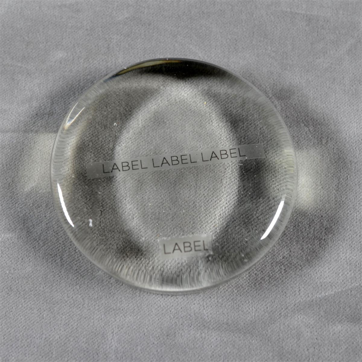 Displaying crystal objects in dining room settings as well as in glass-fronted and glass-shelved cabinets. We've been applying tri-part labels printed on white paper in very small type and sandwiched between barrier layers. This has been fine for China but we're now turning our attention to the glassware and these white labels stand out quite a bit.
